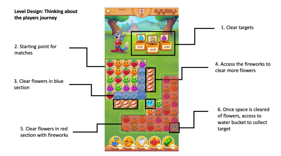 - Set objectives and think about the player journey – how we can prevent the player from achieving this by adding in extra features (additional blockers).