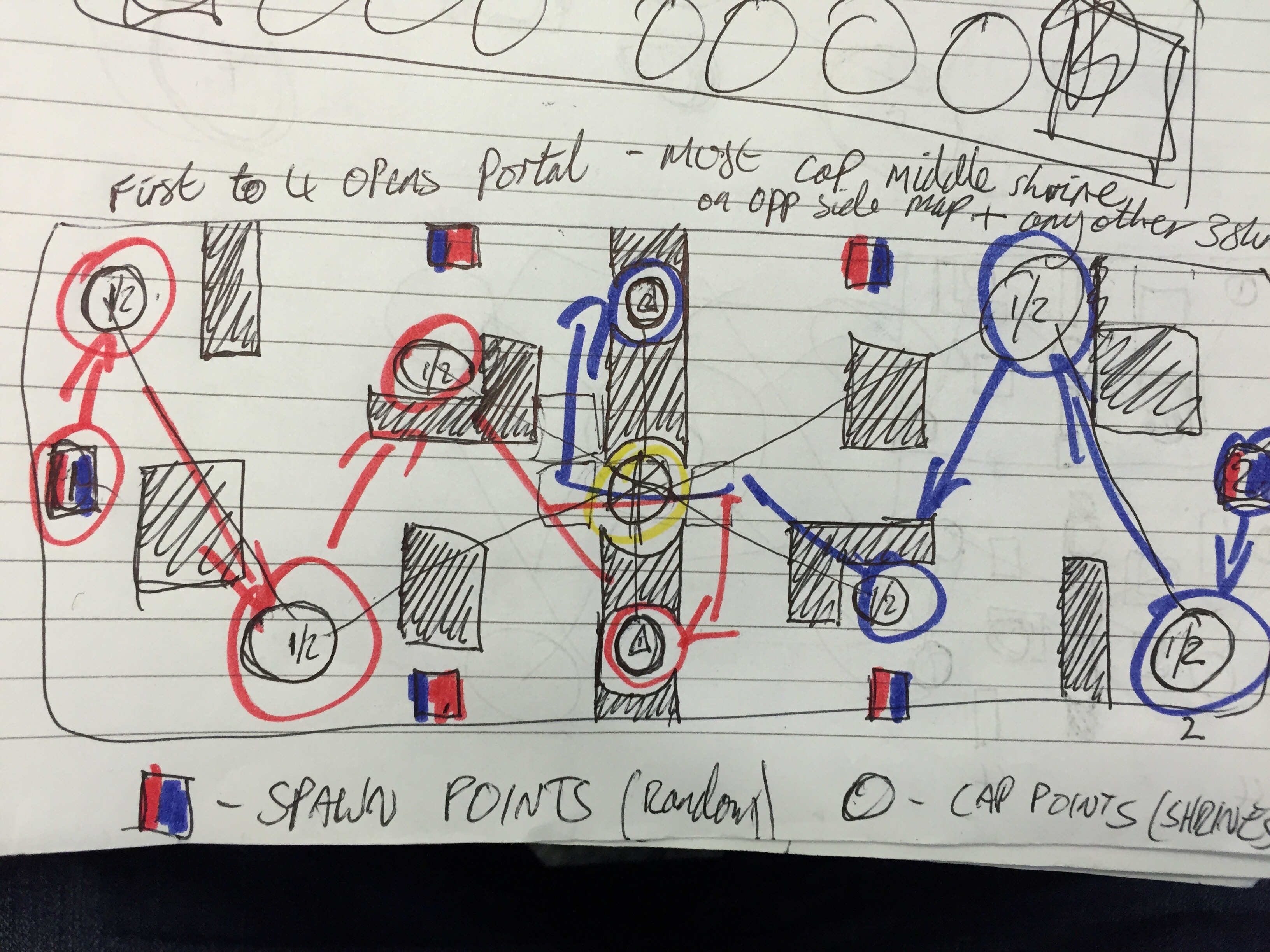 As the only designer on the team it was my job to concept and flesh out the idea for the theme of the game jam. Once finalised my primary job was to design the multiplayer level and player abilities. The level design went through a few iterations through play testing several times by my self and with my teammates. The main issue of the level design was that players wouldn’t interact with each other very much as they were so focused on getting the objectives. Shown further below is a video of an old build displaying this problem. To combat this I redesigned the map to be longer with 4 objectives either side, with mandatory objectives on the opposite side of the bottle neck so players are forced to pass each other resulting in combat. I then added 4 new spawn points closer to the capture points and didn’t allow players to spirit dash through the two central blocks next to the portal so the game was more balanced and competitive.