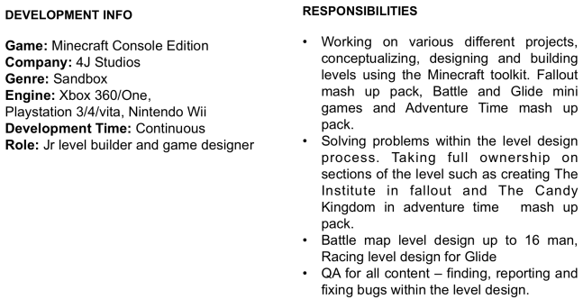 - Conceptualising, designing and building levels using the Minecraft toolkit for Xbox one and 360, PlayStation 3, 4 and vita and the Wii U.